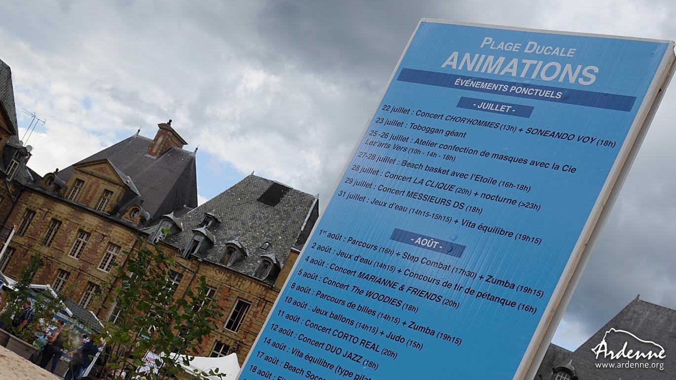 L'accès à la place et les animations sont gratuites, à l'exception de 2/3 jeux d'eau pour enfants. La Plage Ducale est une initiative de la Ville de Charleville-Mézières. Elle dure jusqu'au 20 août.